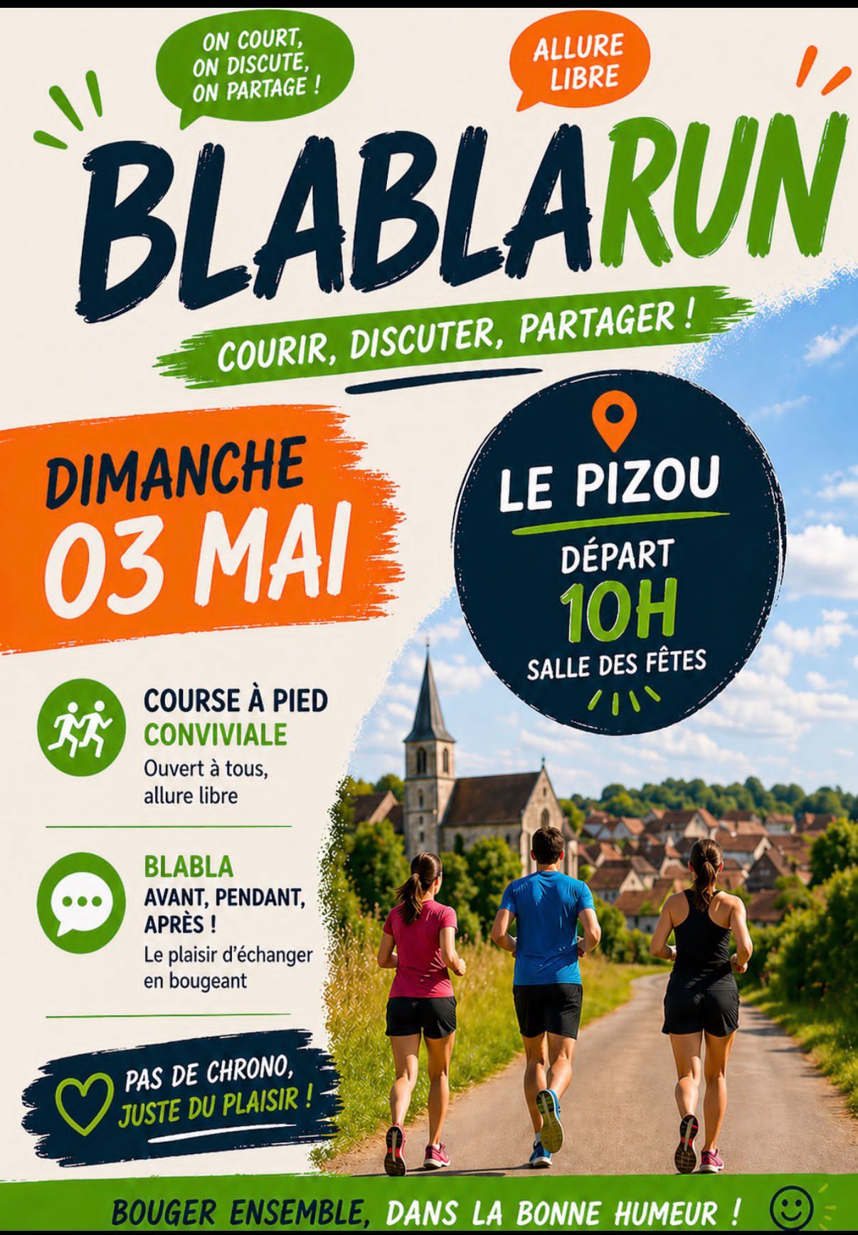 Blablarun – Course à pied conviviale, ouvert à tous, allure libre, on court, on discute, on partage, pas de chrono – RDV à 10h salle des fêtes