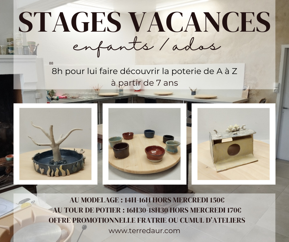 Un savoir-faire ancestral, une large gamme de possibilités : Aurore met son savoir-faire et son expérience au service de chacun, qu’il soit débutant ou confirmé. Elle propose, en petit groupe, des initiations sur rendez-vous, pour vous faire découvrir les bases du modelage et du tournage ainsi que des cours de poterie à l’année, adaptés à tous les niveaux. Les participants peuvent ainsi découvrir les techniques du modelage et du tournage, et donner vie à leurs propres créations. Des ateliers sont également disponibles pendant les vacances scolaires pour les enfants.